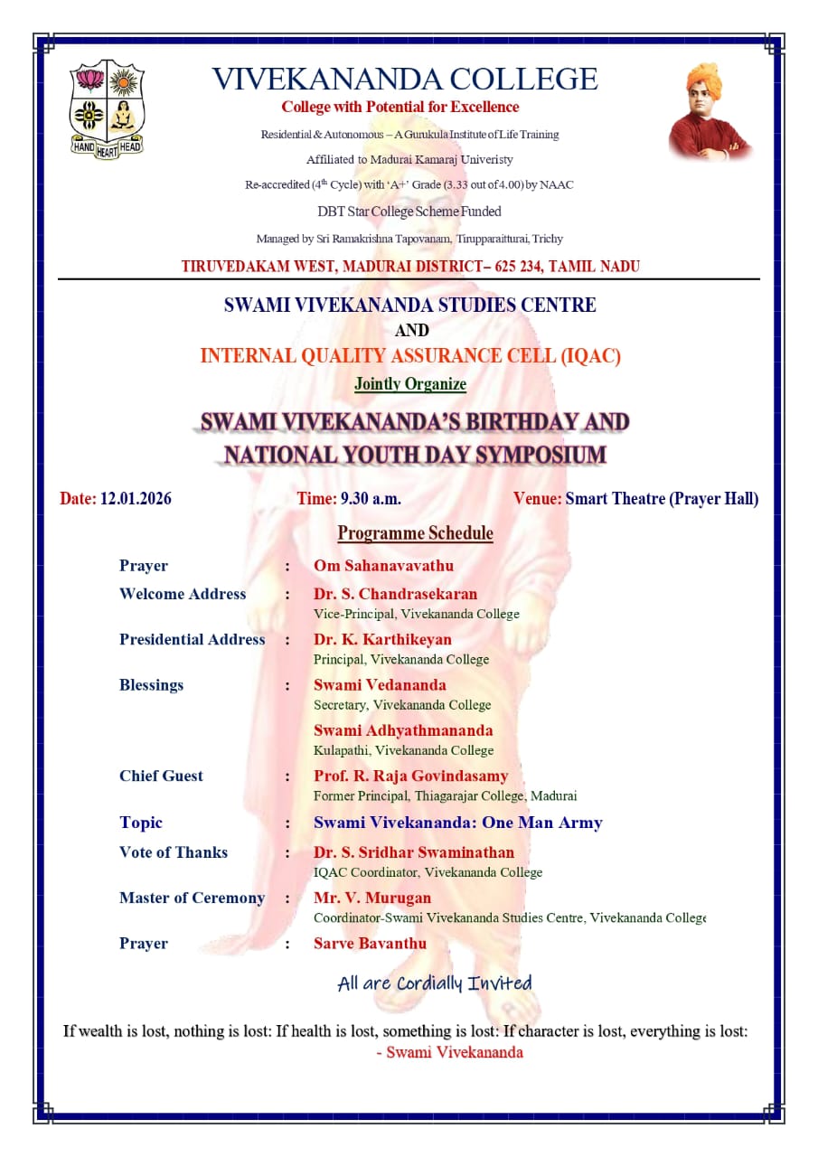 Copyright © 2010 All Rights Reserved Vivekananda College, Tiruvedakam West, Madurai.
