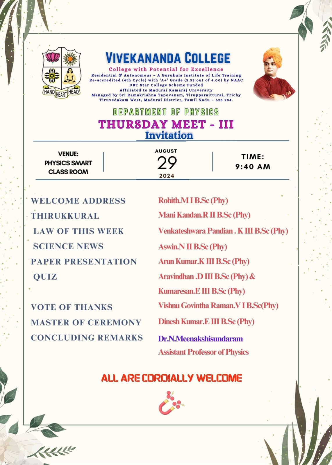 Copyright © 2010 All Rights Reserved Vivekananda College, Tiruvedakam West, Madurai.